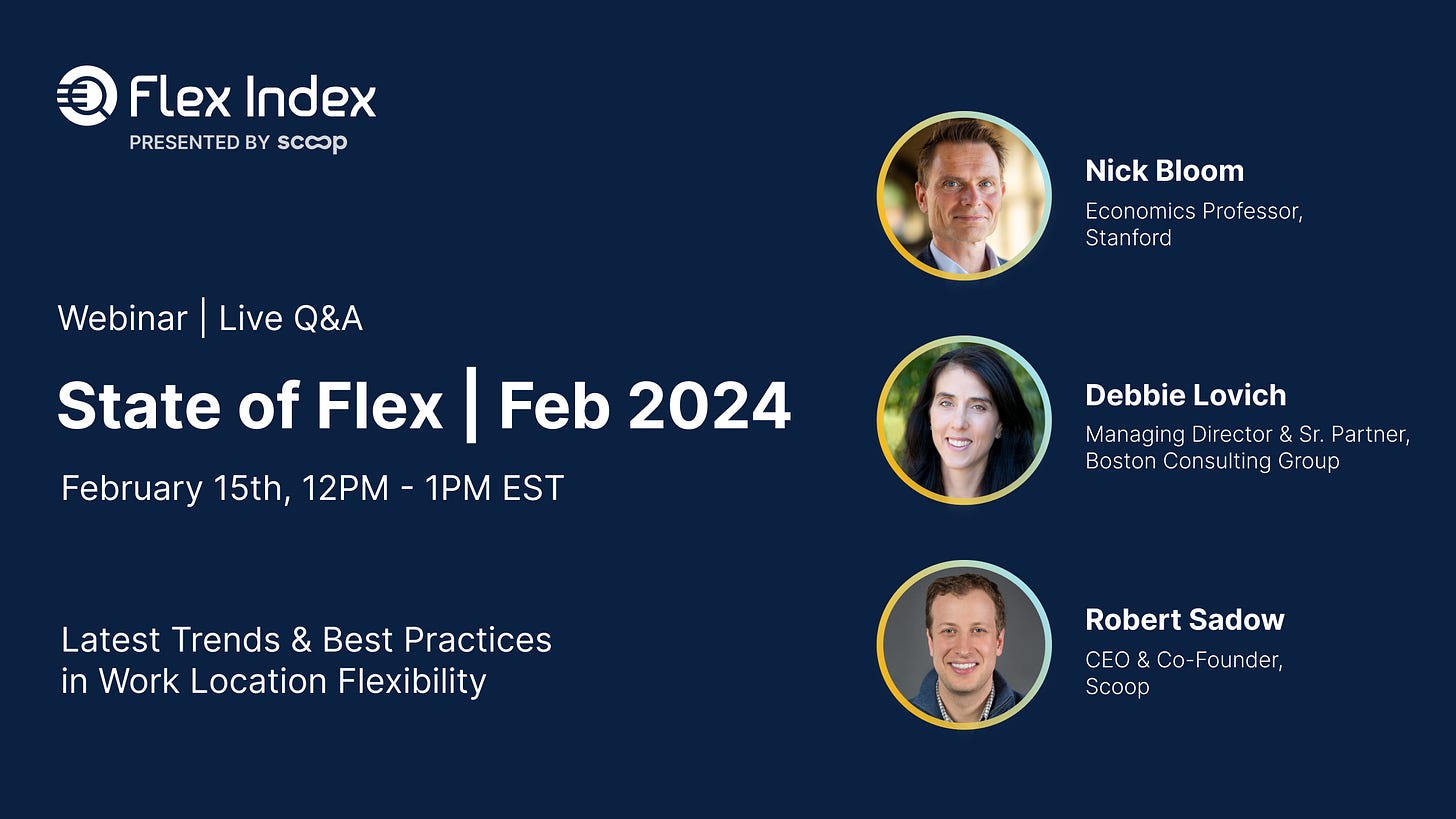 Three of the most respected thought leaders on the future of work — Nick Bloom (Stanford), Debbie Lovich (Boston Consulting Group), and Rob Sadow (Scoop, Flex Index) — will delve into the latest data, insights, and trends in the ever-evolving landscape of workplace flexibility.