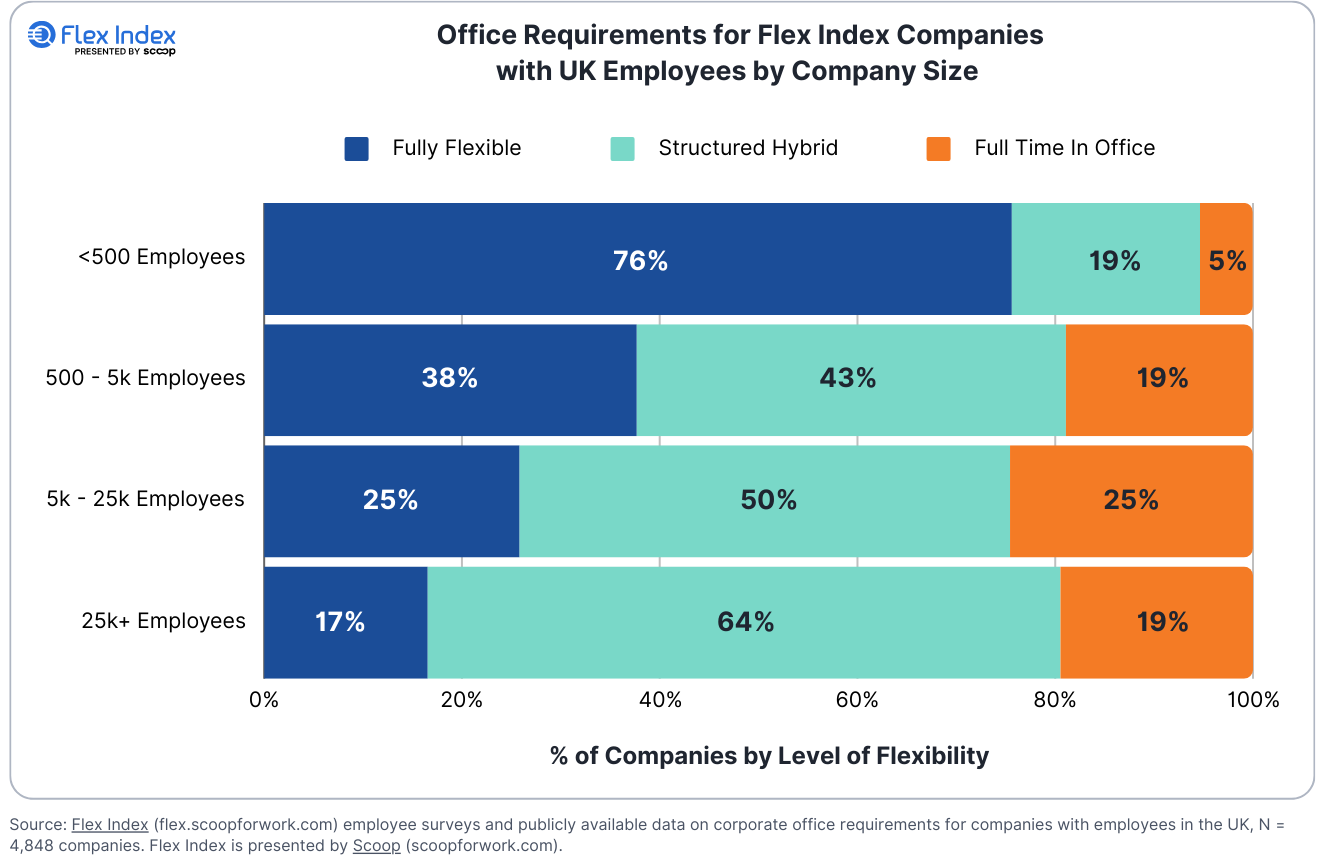 But as companies get bigger, we see a divide emerge. Only 17% of UK employers with 25,000+ employees offer Full Flexibility; most are Structured Hybrid.