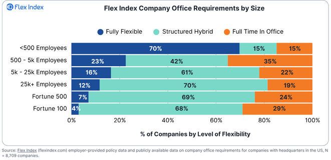There continues to be a significant distinction in flexible work approach between smaller firms and larger enterprises. 70% of companies with less than 500 employees are Fully Flexible, while just 12% of enterprises with 25,000+ employees are Fully Flexible. Large firms are much more likely to be Structured Hybrid: 70% of 25,000+ employee companies vs 15% of firms with 500 employees or less.