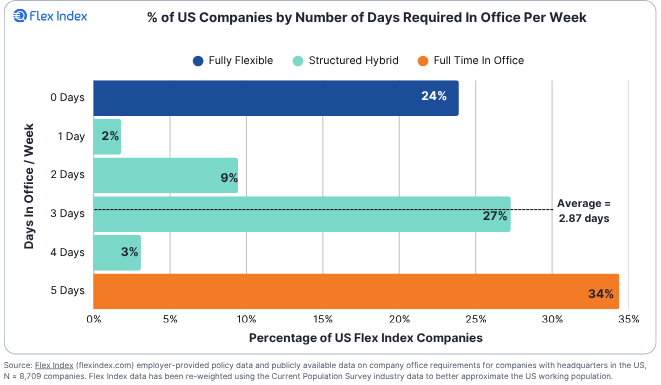 The average US firm requires 2.87 days per week in office, up from 2.49 days in Q2 2024. 58% of firms are polarized: 34% require Full Time In Office while 24% have no weekly minimum. One-day (2%) and four-day (3%) requirements remain uncommon.