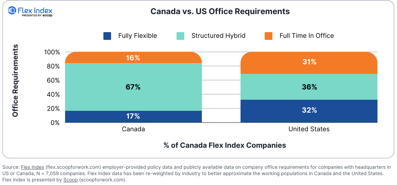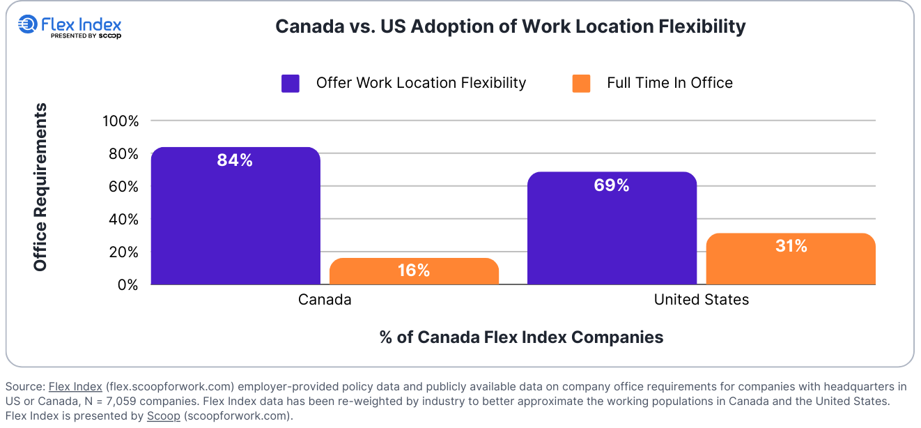 84% of Canadian firms offer work location flexibility (compared to 69% of U.S. companies), with just 16% requiring employees to be Full Time in Office.