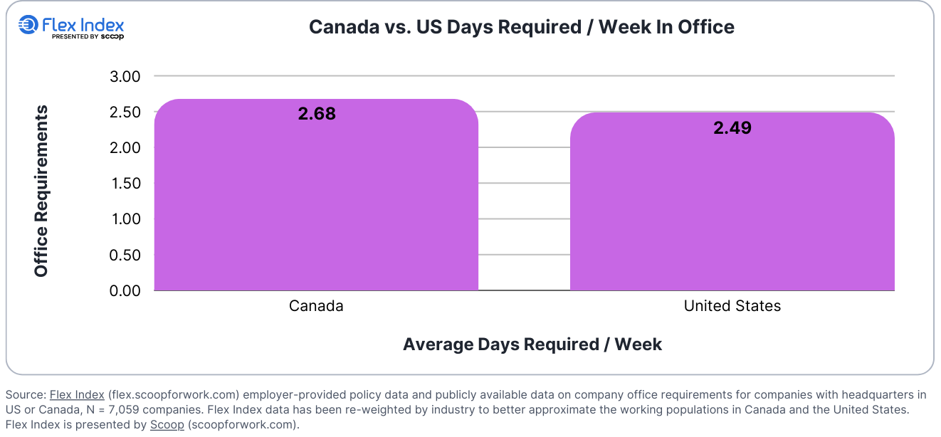 The average Canadian is expected to come into the office more frequently than the average American, mostly due to a higher prevalence of Structured Hybrid models.