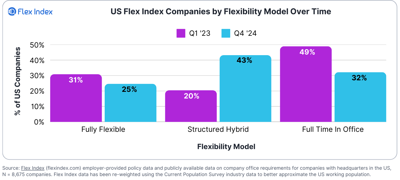43% of US firms on an industry-adjusted basis are Structured Hybrid, up from 20% in Q1 2023 and 38% in Q3 2024. Full Time In Office is the second most common work model. Fully Flexible models — where employees do not have any required office time — have dropped in prevalence from 31% of US firms in Q1 2023 to 25% of firms today.