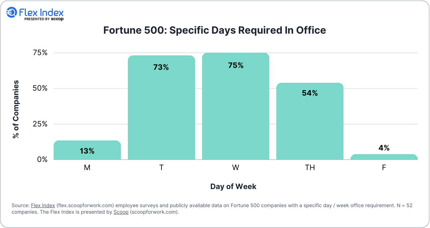 Mondays, and especially Fridays, still look free and clear of a commute if you work at a Fortune 500 company. Only 13% of Fortune 500 companies with a Specific Days / Week policy require Mondays, and a tiny 4% require Fridays.